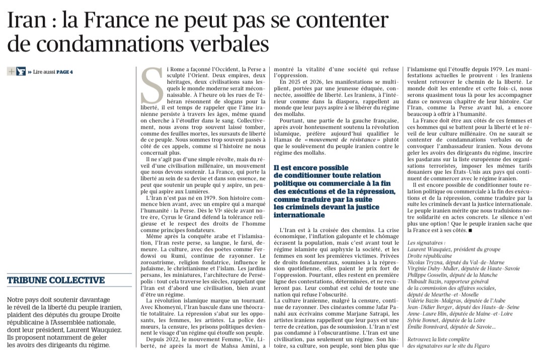 Partager la publication "Le Figaro – Tribune – Iran : La France ne peut pas se contenter de condamnations verbales"